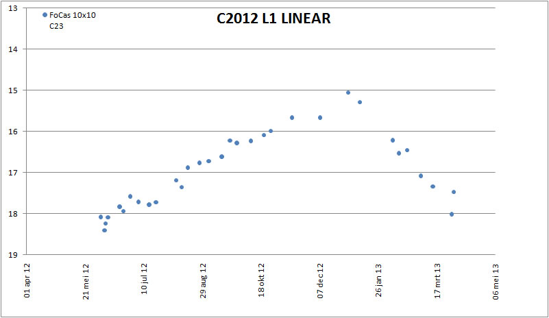 FoCAs II 10x10 Light curve of C2012 L1 LINEAR COD C23 CATALOG: USNO A2.0 / CMC-14 - BAND: R