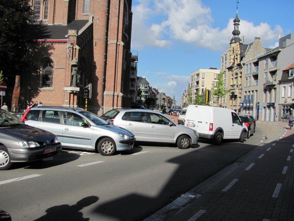 veelal staan er nog auto's aan te schuiven uit de Lode de Boningestraat. Om het fietspad zelf op te rijden