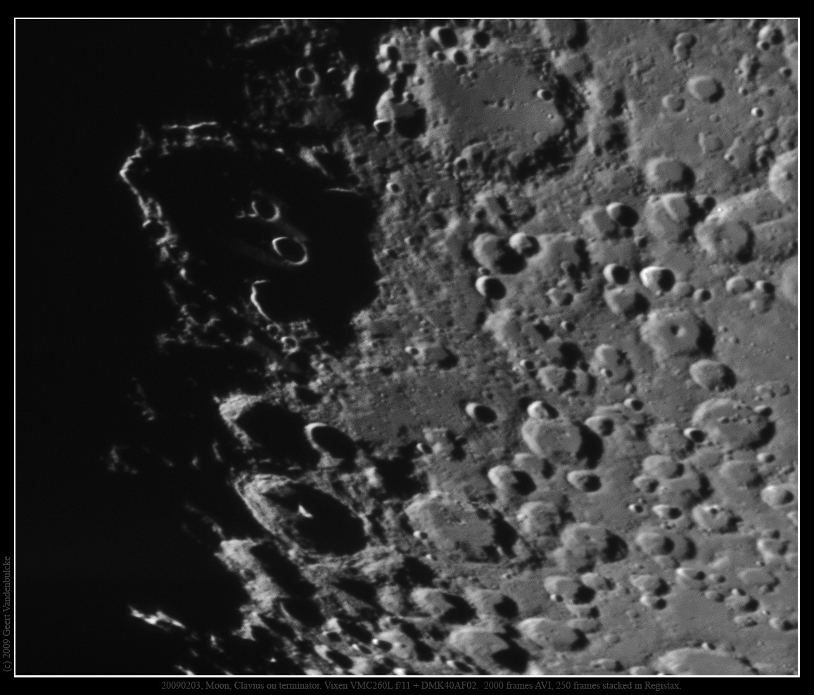 Vixen VMC260L @f/11 (prime focus) + DMK41AF02, red filter, mosaic of two images showing Clavius and southern Moon region.